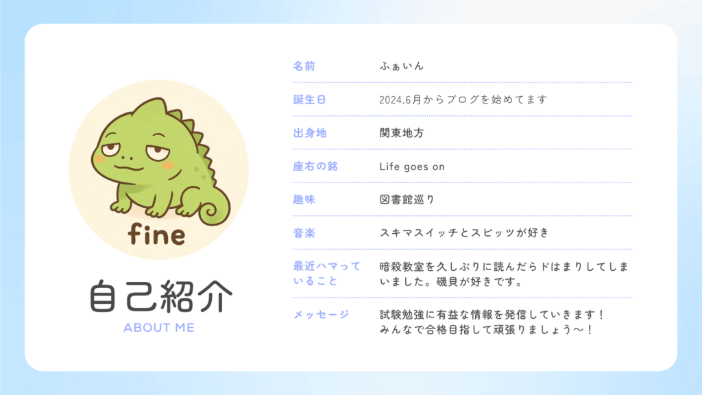 ふぁいんブログへようこそ X Facebook はてブ Pocket LINE コピー 2024.07.072025.09.23 こんにちは!ふぁいんです。 私は保育士・幼稚園教諭・社会福祉士の資格を持っています。 そう、資格試験大好き人間です! 現在は大学で事務員として働きながら公務員試験対策を研究しております。 公務員を目指す人が少しでも合格に近づくために私の知識をこのブログにすべて捧げたいと思います! ひとつよしなに